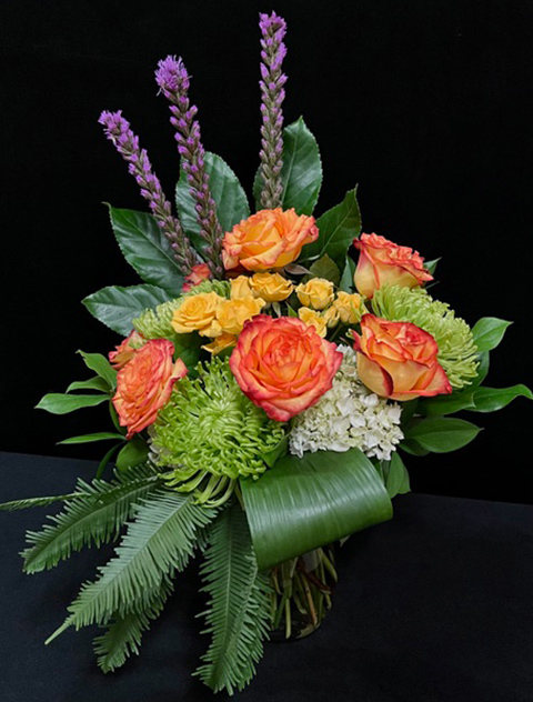 A delightful combination of bi-color roses, green hydrangea, big green chrysanthemums, purple liatris, big leaves and ferns. Colorful, happy and vibrant it will brighten up even the darkest day and make anyone smile!